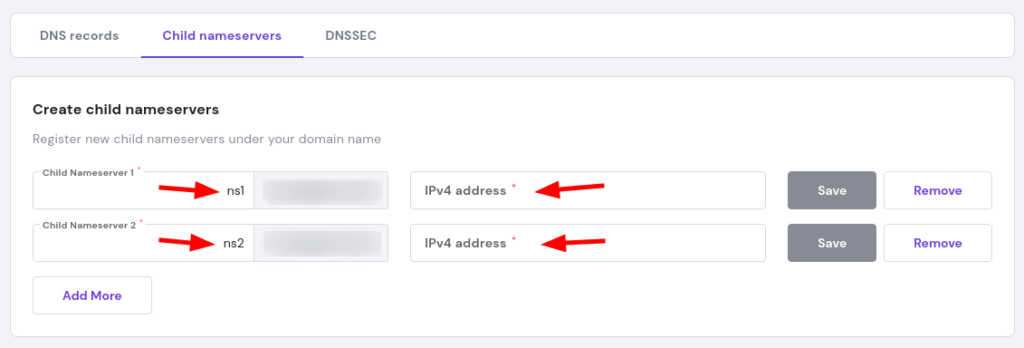 - Child Nameserver: diisi dengan ns1, ns2, atau nama yang Anda inginkan